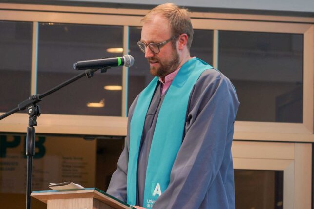 Seguidamente, el vicerrector académico, Bradley Hilgert, pronunció su discurso, el cual inició con una buena y una mala noticia. La buena es que las y los graduados culminaron un trabajo de valentía y de suma importancia, eligiendo un camino que no solo transforma sus vidas, sino también el tejido de nuestra sociedad. La mala noticia, agregó, es que quienes nos gobiernan aún les cuesta entender esa importancia. La prueba es que no consideran las carreras artísticas como de interés público, subestimando el impacto que tienen en nuestra cultura, nuestra economía y, sobre todo, en nuestra humanidad. “Quisiera, entonces, reflexionar hoy sobre lo fundamental que es para nuestras sociedades contar con el arte y una educación en artes”.