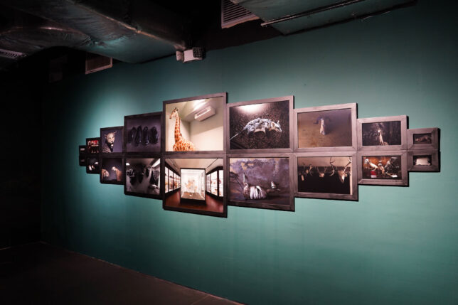 “Las fotografías destacan la ficción de los hábitats creados y subrayan la construcción de una teatralidad con una escena y un guion. Si en los zoológicos, la mediación humana muestra una ficción con tintes documentales, los museos de historia natural proponen una narrativa ficticia que define una pose característica del animal y condiciona el entendimiento sobre las especies”. Las imágenes a las que hace referencia el texto son de: Leopardo de las nieves, Huesos, Aves de Perú, Mono congelado, Jaguar, Tigres, Manos de mono en estudio de taxidermia, Cabezas, Jirafa, Antílopes, Zarigüeya, Llama en estudio de taxidermia, Cabeza de camero en estudio de taxidermia, Cráneos, Nandú, Monos de Perú, Zorro y Piel de llama en estudio de taxidermia.
