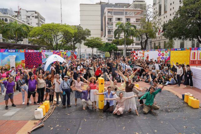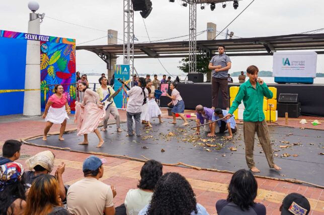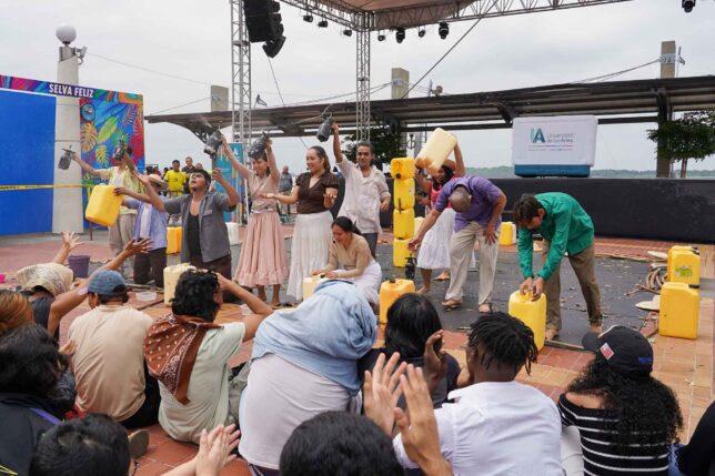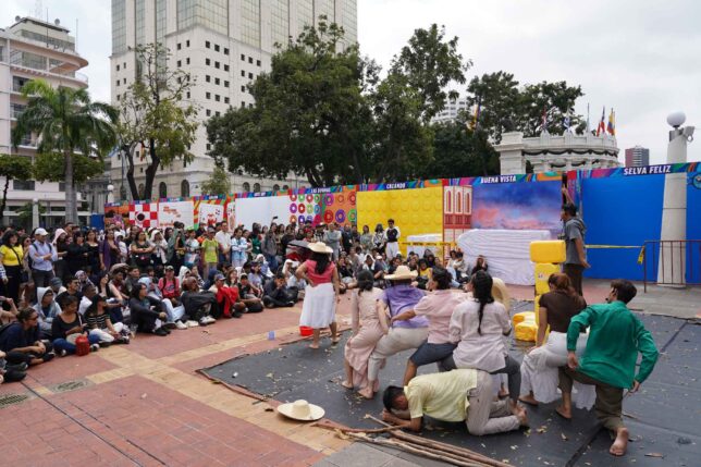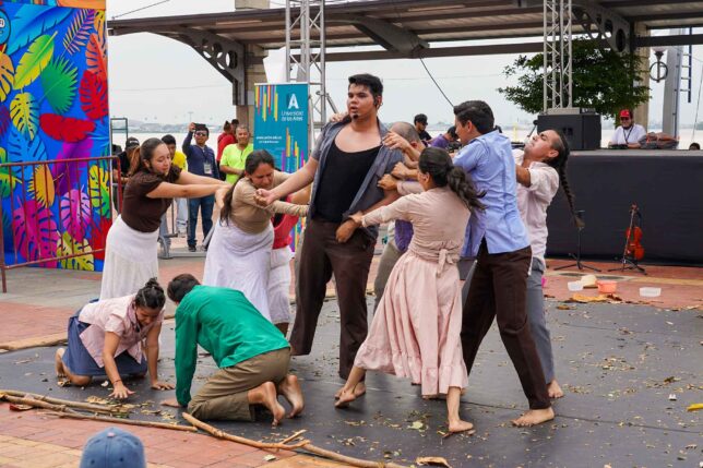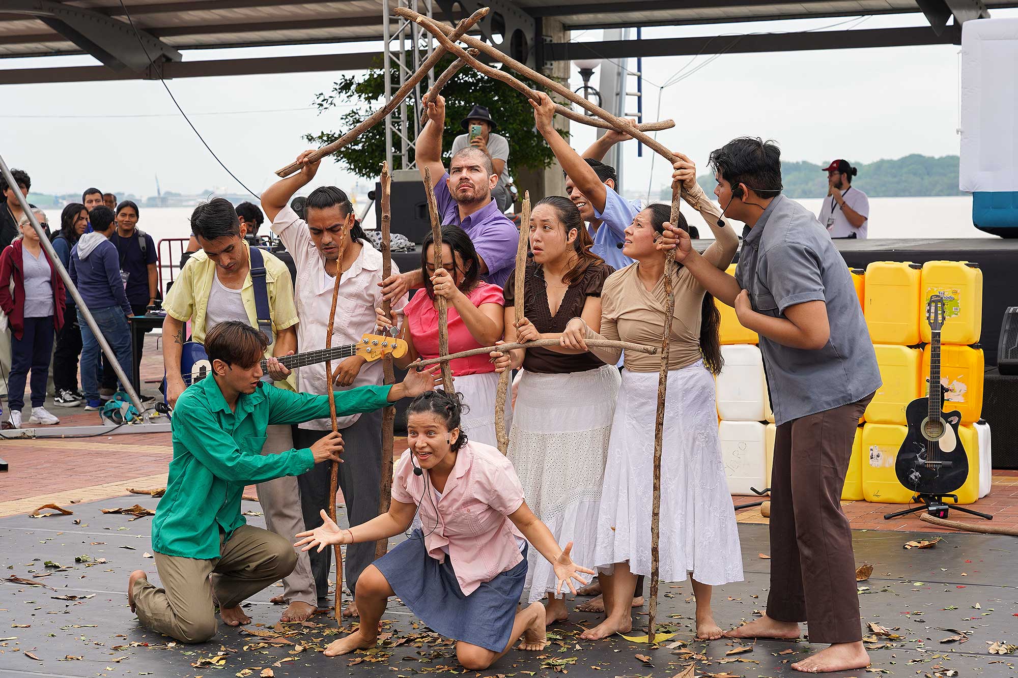 La explanada que se encuentra junto al Hemiciclo de la Rotonda, en el Malecón Simón Bolívar, se transformó este martes 15 de julio en un escenario vivo de memoria, resistencia y arte. En el marco de la V edición de Inter[•]actos, encuentros públicos de arte, el Colectivo Atávico presentó la obra “Biritute, el secuestro de la lluvia”, una creación teatral que entrelaza historia y denuncia con un profundo trasfondo antropológico y simbólico.