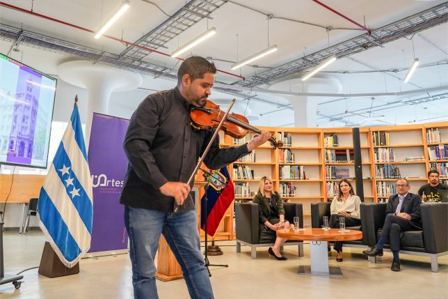 En la presentación del evento intervino Ronny Ramos, analista de convenios de la Dirección de Vinculación con la Sociedad, quien a manera de introducción señaló que “UArtes EP promueve la relación permanente de la Universidad de las Artes con el entorno local, nacional e internacional, a través de la administración y la gestión logística y operativa de comercialización de productos, bienes y servicios de carácter artístico, cultural y científico, con el fin de contribuir al fortalecimiento de la educación y las artes, así como al fomento de la economía de la cultura”.
