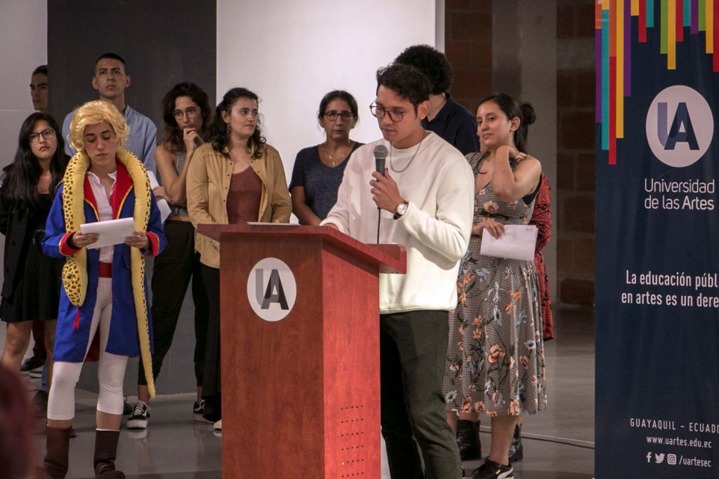 Partiendo de la temática “El artista y la muerte”, estudiantes de la UArtes presentaron una variedad de disfraces, siempre es divertido ver conversar al Principito con Medardo Ángel Silva; es martes y esto es Guayaquil, porque no sería normal esto. Ante nosotros también están Frankenstein y el dios sin rostro (GOT), después llegó “La Catrina”, aunque algo tímida, al final se sumó al particular grupo junto a la docente Cecilia Velasco, quien con una estola fucsia de plumas, completó el particular paisaje. Los ganadores del primer premio fueron Medardo y El principito, quienes al recibir el regalo, procedieron a compartirlo detrás del escenario, pero lo que todos nos preguntábamos en verdad era: ¿sobré que temas conversarán estos personajes cuando el telón se haya caído?