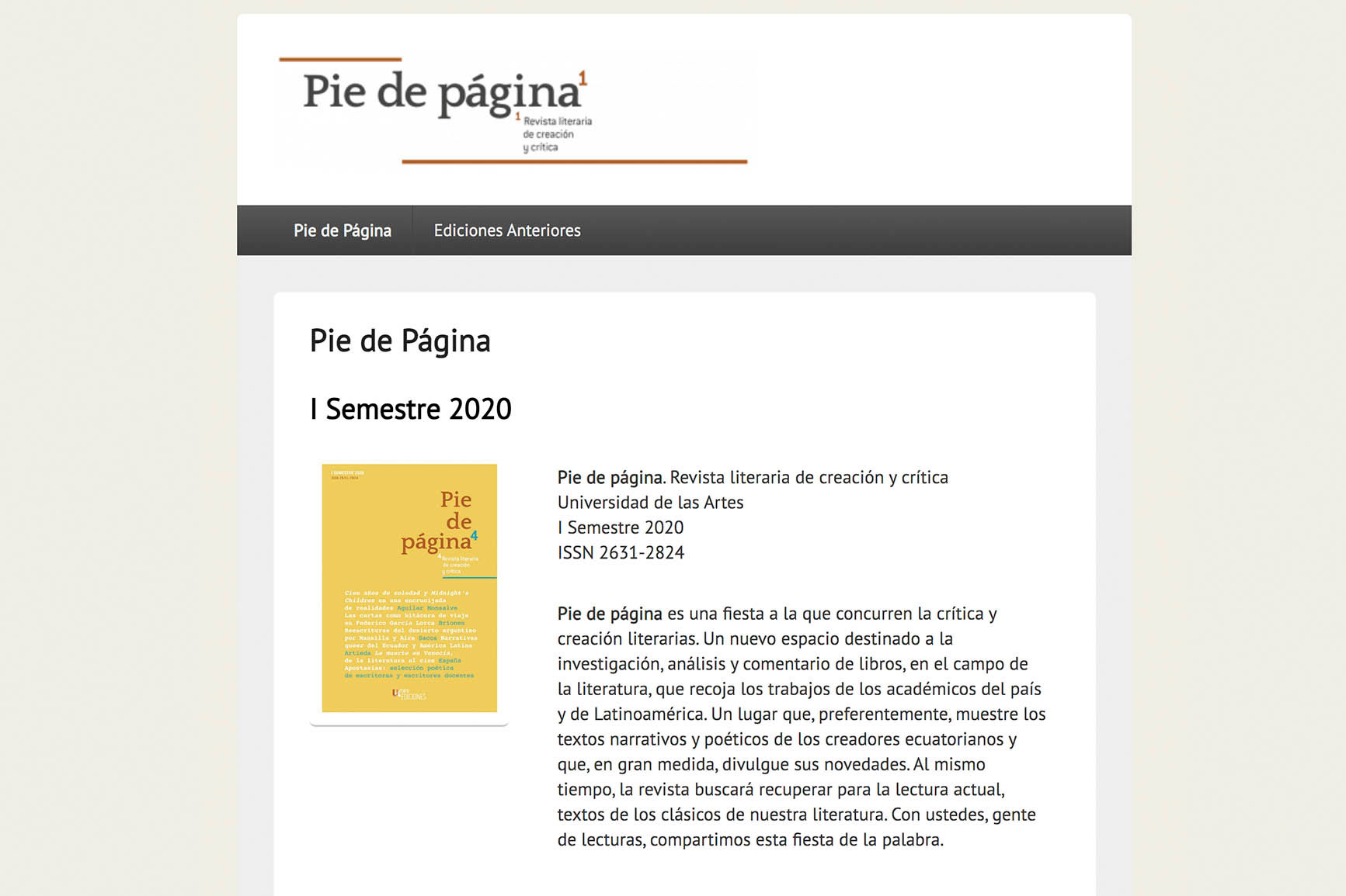 La descripción consta en el sitio web de la revista (http://piedepagina.uartes.edu.ec/), la cual se edita desde la Escuela de Literatura de la Universidad de las Artes y cuyo nuevo número –el quinto– será dado a conocer en la jornada inaugural de la VI edición del Encuentro de Editores Independientes Libre Libro 2020, programada para este miércoles 16 de diciembre, a partir de las 19:00. La cita que, por primera vez y dadas las circunstancias de la pandemia por el COVID-19, es virtual, se extenderá hasta el viernes 18.