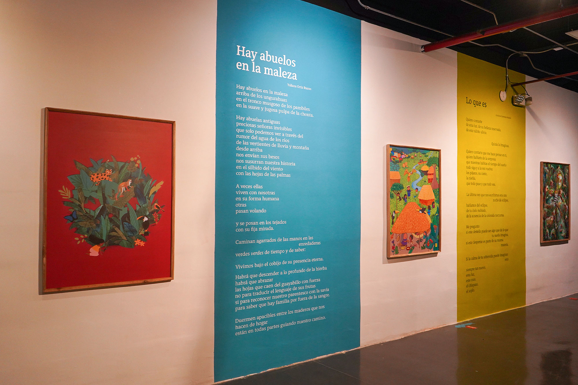 Al ingresar, las ampliaciones de parte de su contenido, tanto de texto como de fotografías, plasmadas de pared a pared y de piso a techo, recibe al visitante para sumergirlo en fantásticas creaciones. Los poemas “El animal que no existe”, de María Auxiliadora Balladares; “Una jirafa me encuentra”, de María Fernanda Martínez; “Exteriores”, de Maritza Cino; “Abuelos en la maleza”, de Yuliana Ortiz; y “Lo que es”, de Giulianna Zambrano. Un ejemplar del libro en un pedestal esperando ser leído, una barca con el nombre Priscila, videos instalaciones, igualmente en grandes dimensiones el epílogo de Diego Mosquera y el escrito “Qué clase de bosques son los de tras de los Andes”, cuyo autor es Juan León Mera.