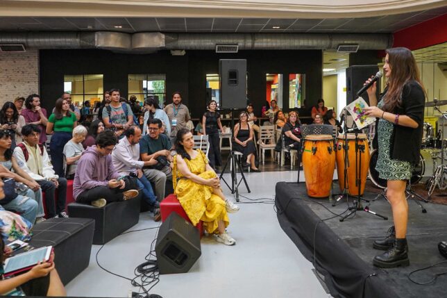 Entonces hubo la bienvenida a la IX edición de Libre Libro. En la presentación, Camila Corral manifestó también que estaba principalmente dedicada a los lectores y a celebrar el trabajo colectivo y creativo de quienes crean espacios de encuentro críticos y sensibles en torno a los diversos actos de lectura. “Con el tema de este año, ‘Comunidades creativas de lectura’, hemos querido resaltar a nuestra propia comunidad universitaria como actores imprescindibles de esta feria”, sostuvo Corral, quien destacó la participación de todas las escuelas de la UArtes. “La programación de esta novena edición ha sido construida de manera colectiva. Construimos una agenda que surge de muchas voces, muchas creatividades y muchas sensibilidades”.